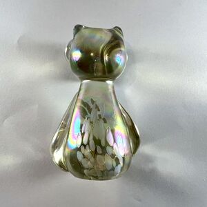 This vintage owl crystal figurine paperweight is a stunning piece that will add character to any collection. Crafted with art glass production style, it features large iridescent eyes that bring the owl to life. Made of glass, it is a durable and unique addition to any decorative pottery and glassware collection. The paperweight was manufactured in the 1970s, adding to its charm and vintage appeal. Perfect for anyone who loves paperweights or art glass, this owl figurine is a must-have for any collector.