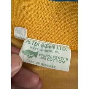 Authentic vintage 1970s Pan World S.C. soccer jersey made by Peter Green Ltd. (West Chester, PA). Features bold yellow and blue color-blocking, retro striped collar and cuffs, and printed crest with Pan World S.C. on front and #21 on back in classic 70s typography.