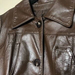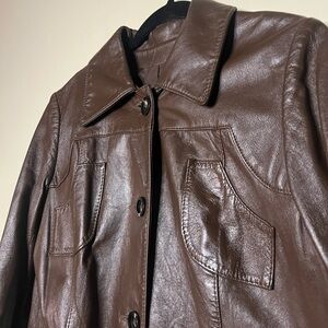 Special 1970’s vintage leather jacket coat. This jacket is handmade in New Jersey. Hand written lot number on tag. Tagged a size 14 but would best fit a modern day S-M. See measurements below. Sewn in belt, long enough to tie in a bow or knot as desired. Buttons are tortoiseshell. No damage to lining. Minimal wear to leather, see photos.