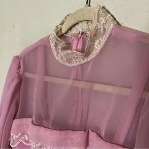 tags: rococo, Vintage 1970s gown, pink chiffon lace dress, retro 70s dress, elegant vintage gown, vintage formal wear, 70s evening dress, chiffon lace dress, vintage wedding guest dress, small-medium vintage dress, timeless vintage fashion, retro chic gown, classic vintage dress, 1970s fashion, feminine lace gown, vintage prom dress, collectible vintage dress, vintage couture, delicate lace dress, romantic 70s style, vintage party dress