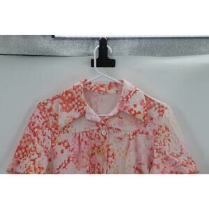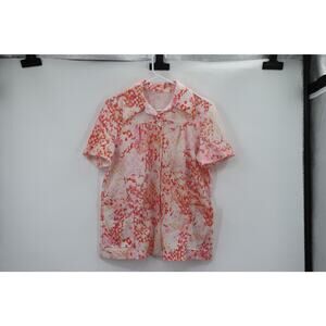 This blouse is pink geometric pattern shortsleeve. It is a rayon/polyester blend. Would fit a size medium roughly. Has pockets. 19 p2p 25 length