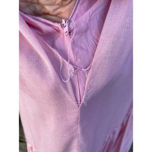 Here for your consideration is a nice vintage 1970s pink JCPenny maxi dress. It is 65/35 Poly/cotton and a size 7/8. Here are the measurements with the dress flat and taken from one side. Shoulders 15" pit to pit 16" waist 13.25" length 58". This has a few flaws. one of the loops that holds the button on the sleeves is snapped. There are a couple light faint small spots. The back where the zipper ends the fabric has a couple of loose stiches. Overall this is in good wearable vintage condition.