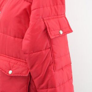 Vintage 1970s era red puffer jacket with multiple snap pockets, sweater sleeves and both zipper and snap front to keep the chill out.