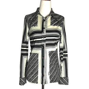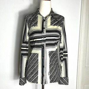 Amazing signed graphic print blouse with pointed collar, stretchy lightweight polyester.