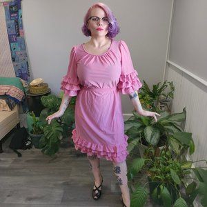 Vintage 1970's rose pink shift dress with ruffle cuffs and hem. This dress is so flirty and fun! Comfortable and easy to wear, pullover style rose pink lightweight polyester dress. Wide scoop neck, half length sleeves with triple tiered ruffle cuffs. Matching tiered ruffle hem. Includes a matching fabric belt. No zippers or closures. Unlined.