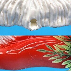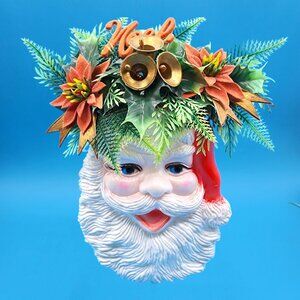 Add a touch of vintage Christmas charm to your home with this 1970s Santa Claus wall decor. Featuring bells, flocked poinsettias, and plastic holly, this piece is perfect for collectors or holiday enthusiasts.