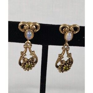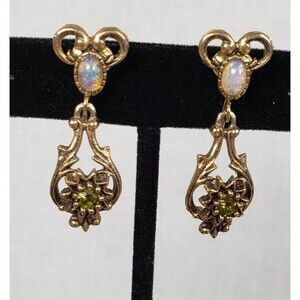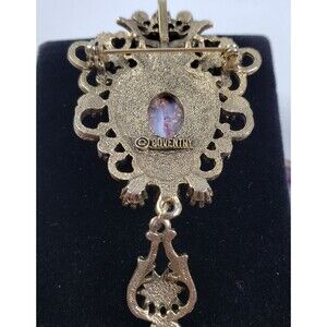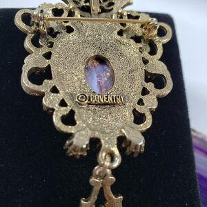 In a Victorian-Revival style, Sarah Coventry's "Contessa" line from 1974 features vivid green, pink and purple rhinestones and glass cabochons resembling opals. The brooch can also be worn as a pendant. All pieces marked and signed.