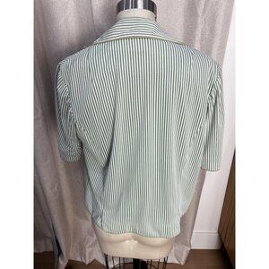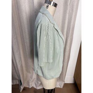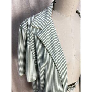 Step back into effortless 70s style with this vintage Serbin of Florida jacket, designed by Muriel Ryan. This lightweight piece features a soft green and white vertical stripe pattern, wide lapels, short sleeves, and the original matching belt with a covered buckle. Fully lined.