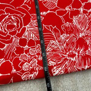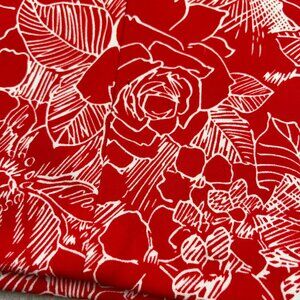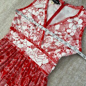 A red and white floral print maxi dress with surplice faux wrap bodice top. Not lined. Skirt has stretch. Also tagging a size 10 since vintage sizing can run small