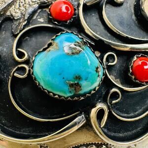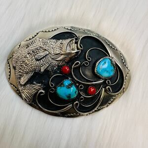 Vintage 1970’s Silver and Turquoise Belt Buckle with Fish. Genuine turquoise and coral accent stones. Native American / Navaho styling. Unmarked and untested. Measures 3.75” x 2.75”.