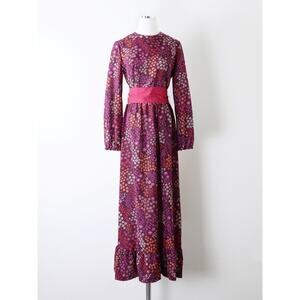 Vintage 1970s Size S Flower Power Print Maxi Dress Mod Hippie Hostess