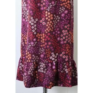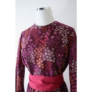 Vintage 1970s bohemian maxi dress in burgundy, purple and orange floral printed poly. This groovy vintage dress features long bell sleeves, sash waist. There is a plastic Talon zipper closure at back. 'Tanner of North Carolina' tag at neck. Marked size '10'.