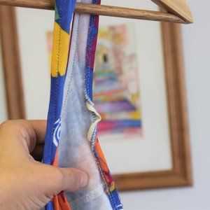 Vintage, One Piece, Skirted Swimsuit. Fun, Novelty Print with Lots of Swirls and Florals. Bright Blue Color. Fitted at Waist at Bust with V Neckline. Adjustable Back Strap. Material Feels like Poly-Nylon. Lightly Lined At Bust - No Cups.