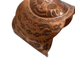 This vintage 1970s cuff bracelet features a solid copper construction with intricate Southwestern etching. Adjustable for a comfortable fit, it adds a unique, rustic touch to any outfit. Best for small to medium wrist size. Some scuffing inside bracelet as pictured