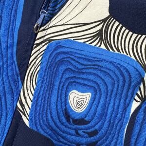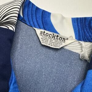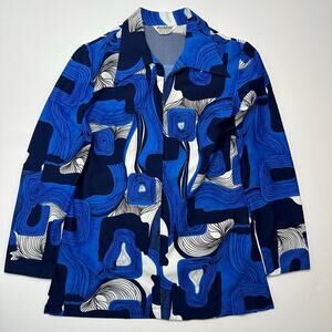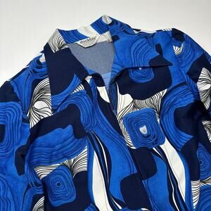Vintage 1970’s Stockton Groovy Zip Front Tunic / Micro Mini Dress. Bold geographic print in navy, royal , black and white. Polyester double knit fabric. Large pointed collar. Zipper front ( only goes about 3/4 of the way to the bottom). Button at sleeve hem. Side slits. The size tag is frayed and almost gone but size appears to be a women’s Medium. See measurements.