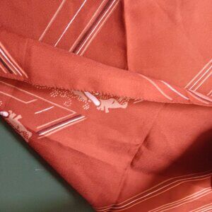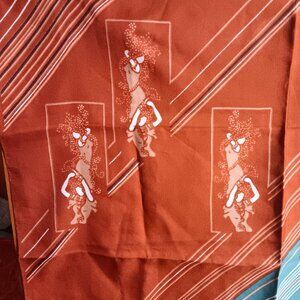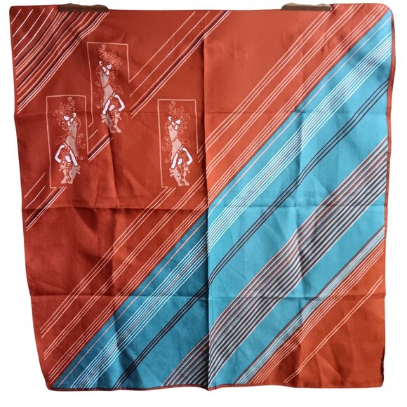 This vintage scarf from the 1970s features a striking tribal print and bold stripes, embodying the era's love for vibrant and eclectic designs. The unique combination of rich colors and patterns not only makes it a statement piece but also a captivating representation of a bygone fashion era, perfect for adding character to your wardrobe.