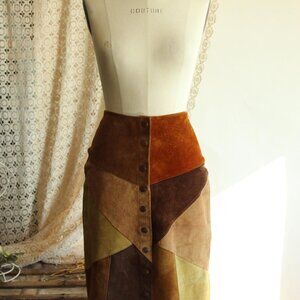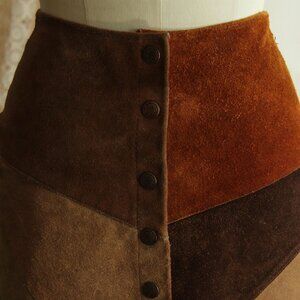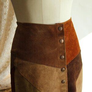 Fun vintage suede skirt circa the 1970s, in autumn shades of browns. Snaps up the front, soft A line, unlined. About a small size, but do see measurements below.