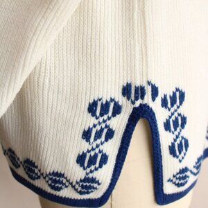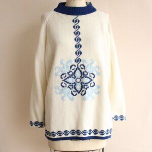 Gorgeous vintage sweater from about the 1970s or so with a Nordic or Traditional Folk feel. Winter white with dark and light blue. Has a ribbed mock turtleneck, raglan sleeves, and a zipper behind one shoulder. Label reads: The Campus Shop, May Co. Larger size, but do see measurements below. Looks and feels like a wool blend perhaps.