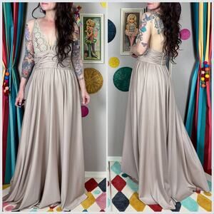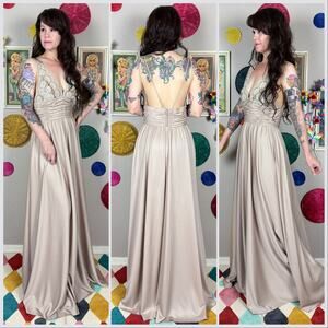 A gorgeous 70s maxi dress! Featuring a scalloped v-neckline with illusion floral lace overlaying a semi sheer flesh toned mesh, double spaghetti straps, open back, ruched empire waist and full sweeping skirt. Back zipper closure. Made from a soft flowy polyester material with some sheen to it. Comes in a neutral taupe, champagne, beige color.