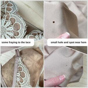 In very good condition with some minor flaws. The straps do look like they were altered at one point but are in their original position now, some light fraying to the lace, one spot on the skirt and one small hole. All shown in photos
