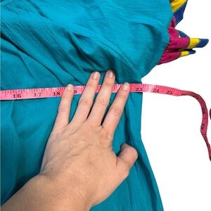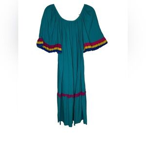 Gorgeous vintage 1970’s teal cotton maxi dress featuring bold rainbow-trimmed ruffle sleeves and a flowing oversized silhouette. Perfect boho-chic statement piece for festivals, retro parties, or collectors of true vintage fashion. Pit to pit measures 23”, best fits XL. Small faint stain on front (see photo).