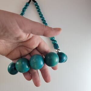 Vintage 1970s Teal Wooden Bead Necklace 27 Inch Chunky Boho Statement Jewelry