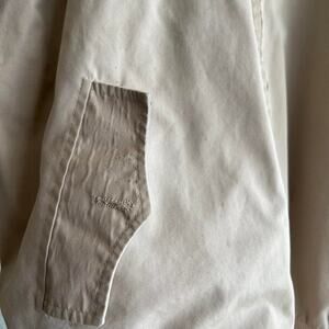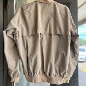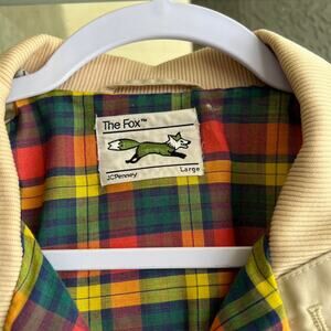 1970's khaki bomber jacket from "The Fox" line from JCPenney. There are some small stains on the front, and one small hole in the left arm as pictured. There are no otherwise major stains, holes, or tears. The tag says size large.
