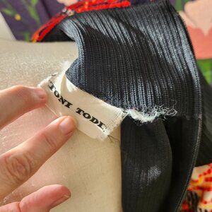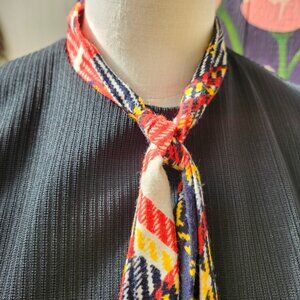 Vintage 1970's Toni Todd plaid maxi dress. A quintessential 70's style piece! So very dark academia, with the perfect tie neck details. By designer Toni Todd, this is a polyknit maxi dress with black heavyweight rib knit polyknit bodice and lightweight smother knit plaid sleeves, collar and skirt. Has cute little cap sleeves over the longer plaid sleeves. The plaid portion is black, red, yellow and white plaid. Features a lovely tie neckline that can be worn in a bow or tied in different styles. Zips up the back with nylon zipper. Unlined.