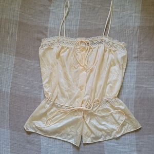 70's Two Piece Sleep Set Vintage 1970s cream colored two piece sleep set. Button down Camisole top. Ties at the top and waist. Also has a snap button on the top and waist. Bottoms have an elastic waist. Elastic is all in excellent condition. No size tag; fits like medium. Bust: 16 inch Length: 18 inch Waist: 13 inch, but lots of stretch. Brand: g's Excellent vintage condition. Like the item but not the price?? I accept all REASONABLE offers! PLUS Recieve FREE SHIPPING on orders $50+ AND 10% off bundles of 2 or more!