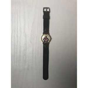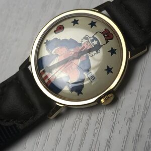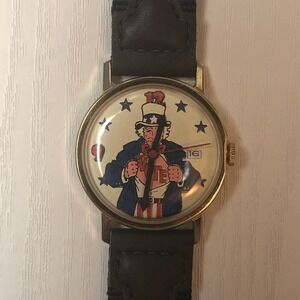 Vintage Uncle Sam red, white, and blue themed watch. Uncle Sam is ripping his shirt off to expose the word VOTE written on his chest. Wind up calendar style watch. Calendar window does function. Watch is a wind up style, runs nicely. Has some scratches on the crystal that you can see if you zoom in on images. The watch band is not original to the watch. It's a vintage deadstock band that is brown and blue in color.