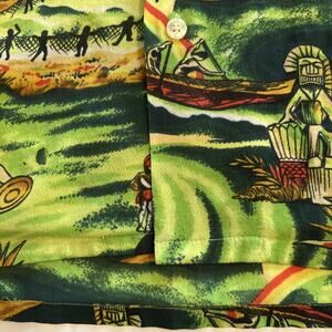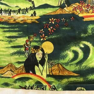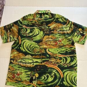 This vintage Van Cort Islander button down shirt boasts a unique Hawaiian print and is made from high-quality polyester material. It's a rare find, perfect for any collector of vintage men's clothing. The shirt is a size large.