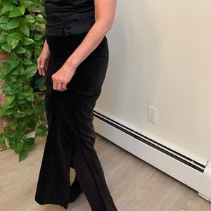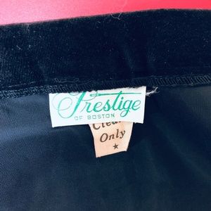 Vintage Prestige brand black velvet maxi skirt. Likely 100% cotton based on fabric and familiarity with different types of velvet. Very good vintage condition. Side zipper. Flat measurements: Waist 13 inches across. Hips 20 inches across. Maxi length 38 inches. Side slits for walking 16.5 inches on both sides. Fits like a modern size 4. Form fitting, very sexy and comfortable. (Please note it is much too small for me now, so it will look better on someone who can actually still wear a size 4!)