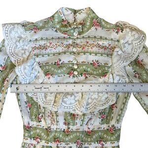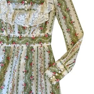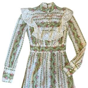 Vintage 1970s Vicki Vaughn Promenade XS Green Floral Prairie Ruffle Maxi Dress