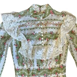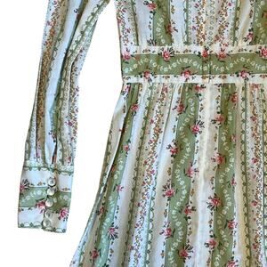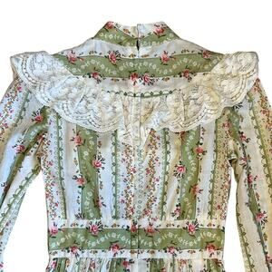 Vintage 1970s Vicki Vaughn Promenade Women’s Sz XS Green Ivory Floral Boho Prairie Ruffle Maxi Dress. Excellent condition.