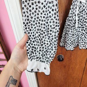 Vintage 1970s black and white geometric print pleated blouse. Semi sheer fabric with a tie belt and ruffled trim. Unfortunately there are no tags. Best fit petite size XS-M. Model is 5'3 size S/M (27in waist). Please see measurements for details. PM me if you have any questions.