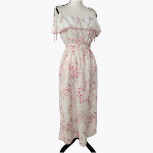 Charming white dress with a pink and green floral print. Accented in lace trim, and pink satin ribbon along the waist. It has spaghetti straps on the shoulder that tie into a bow. Flattering, column shape silhouette with a fitted waist. Attached ties at the waist for a perfect fit. Maxi length. Back metal zipper closure. Made from very lightweight fabric with a synthetic feel. No attached labels, so it might be homemade but the sewing looks professionally done.