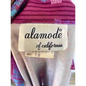 Here for your consideration is a nice vintage 1970s blouse. The brand is Alamode of California. It is polyester and marked size 12. It has little belt loops if you want to add a belt . Here are the measurements with the blouse flat from one side. Shoulders 16" arm pit to pit 19" waist 19" shoulder to hem 24.5". It is clean and free of holes. It is in good wearable vintage condition.
