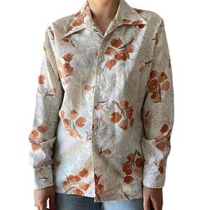 Vintage 1970s Womens Orange Floral Tulip Mid Mod Disco Collar Retro Blouse Sz M