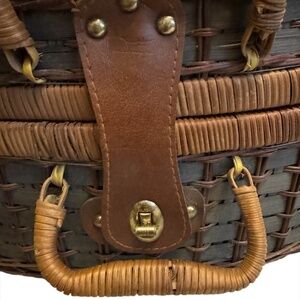 Vintage 1970s woven picnic basket with leather accents. Features a secure brass clasp and chain hinges for smooth opening and closing. The basket is empty, without dishware. There is some minor staining inside, which has been cleaned. Photos of the interior will be posted once it has fully dried. Despite the staining, the basket is in excellent vintage condition, with wear consistent with its age.