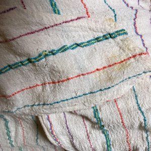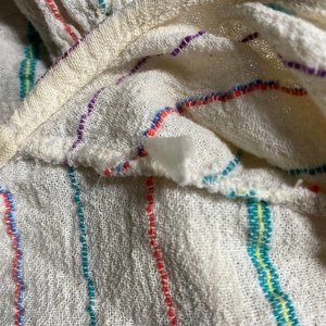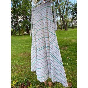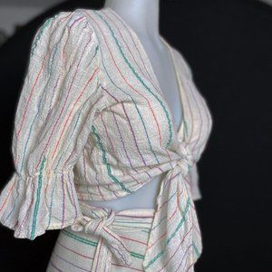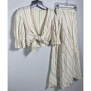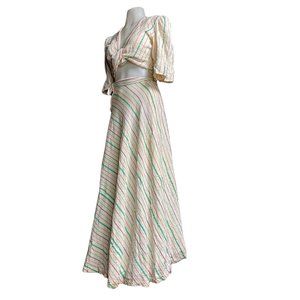 Vintage 1970's 2-pc matching wrap skirt and tie-front crop top. Off-white / ivory with multi-color diagonal pinstripes. Cropped blouse has half-length bell sleeves. Tag is very worn so I'm unable to make out the size or fabric content, material feels like a lightweight cotton gauze.