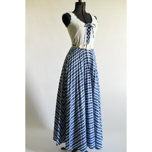 Vintage 1970s XS Blue White Corset Tie Bodice Sleeveless Maxi Dress