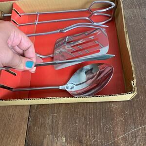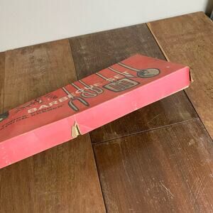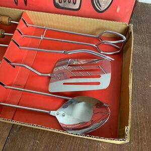 Vintage 1970s five (5) piece metal wooden handle leather loop BBQ Set UNUSED