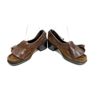 Vintage 1970s women’s brown suede and leather kiltie fringe heeled loafers