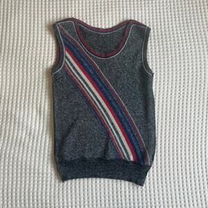 Cute sleeveless knit top of metallic lurex in dark grey with blue, red and white stripe across chest. No labels but seems to be a women's XS, excellent vintage condition.