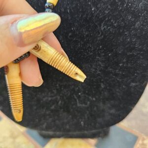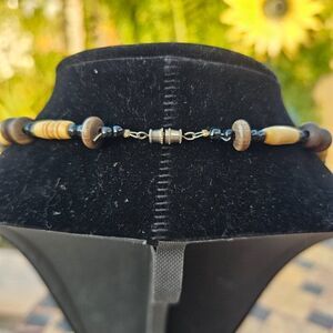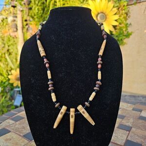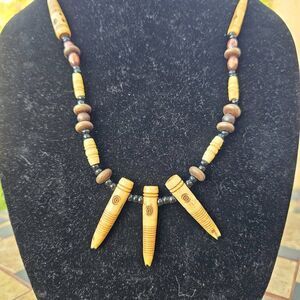 Unique handcrafted necklace. Features wooden beads and accents. Perfect for a natural look.