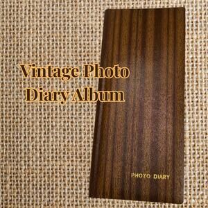 This charming vintage “Photo Diary” album, made in Japan, features a woodgrain-look vinyl cover with gold lettering and a spiral-bound interior. The pages alternate between photo sleeves and lined journaling sections labeled “Date / Place / Occasion,” bordered with delicate floral graphics. A nostalgic keepsake that combines the tactile beauty of analog photography with handwritten memory keeping.