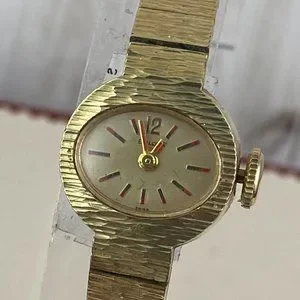 Vintage 1971 (N1) Bulova "Goddess of Time" 20 micron Gold Plated 7 inch link Bracelet great condition, the Bulova watch works it keeps time and is in Plus condition. Size is 7 inches 18Karat 20 Micron Electro Plated Case and Link band, back Larger easy to wind crown 5/8 inch wide Oblong Oval Case Raised gold Markers and Hands with Red Tips Hand Wind Mechanical Watch N1 Swiss Movement Registered 709067 Hand Wind Mechanical original price $65