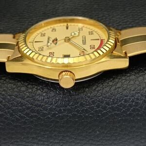 This watch has a stainless steel Case in great condition and almost no flaws. The face features Red accents on a Gold Face giving an awesome vintage look overall. It also has a date function!