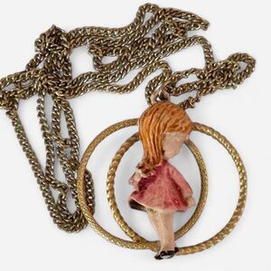 70s charm, whimsical pendant, collectible jewelry, retro accessory, nostalgic necklace, vintage girl charm, pink dress detail, cottagecore style, delicate layered, playful vintage