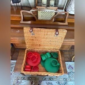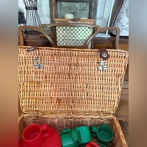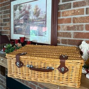 Vintage 1971 Hand Woven Wicker Storage Basket with Leather Accents